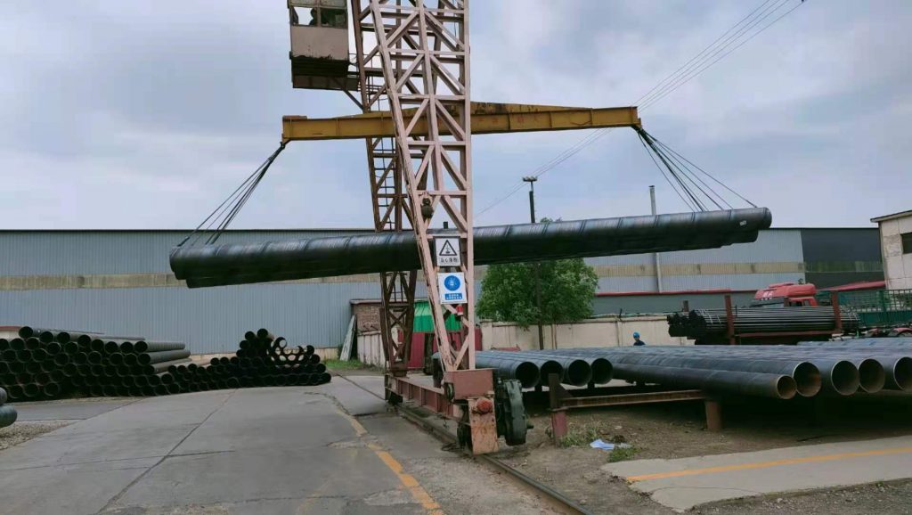 焊完的焊縫均經過在線連續超聲波自動傷儀檢查,保證了的螺旋焊縫的無損檢測覆蓋率。若有缺陷,自動報警并噴涂標記,生產工人依此隨時調整工藝參數,及時缺陷。采用空氣等離子切割機將鋼管切成單根。切成單根鋼管后,每批鋼管都要進行嚴格的首檢制度,檢查焊縫的力學性能,化學成份,溶合狀況,鋼管表面質量以及經過無損探傷檢驗,確保制管工藝合格后,才能正式投入生產。承壓流體輸送用螺旋縫埋弧焊鋼管(SY5036-8是以熱軋鋼帶卷作管坯,經常溫螺旋成型,用雙面埋弧焊法焊接,用于承壓流體輸送的螺旋縫鋼管。